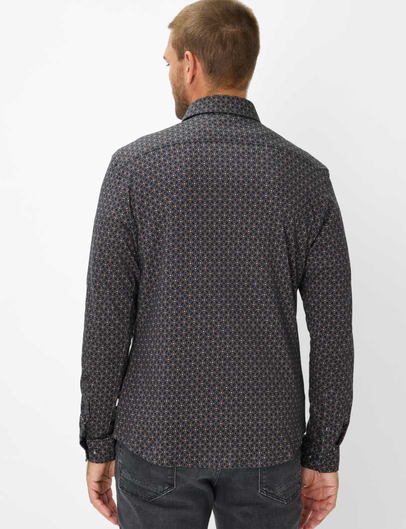 | Design Besonderheiten: | Bedruckte Oberfläche, Kontrasteinsätze an den Manschetten, Kontrasteinsätze im Krageninnensteg, Muster, abgerundeter Saum, taillierte Schnittführung |