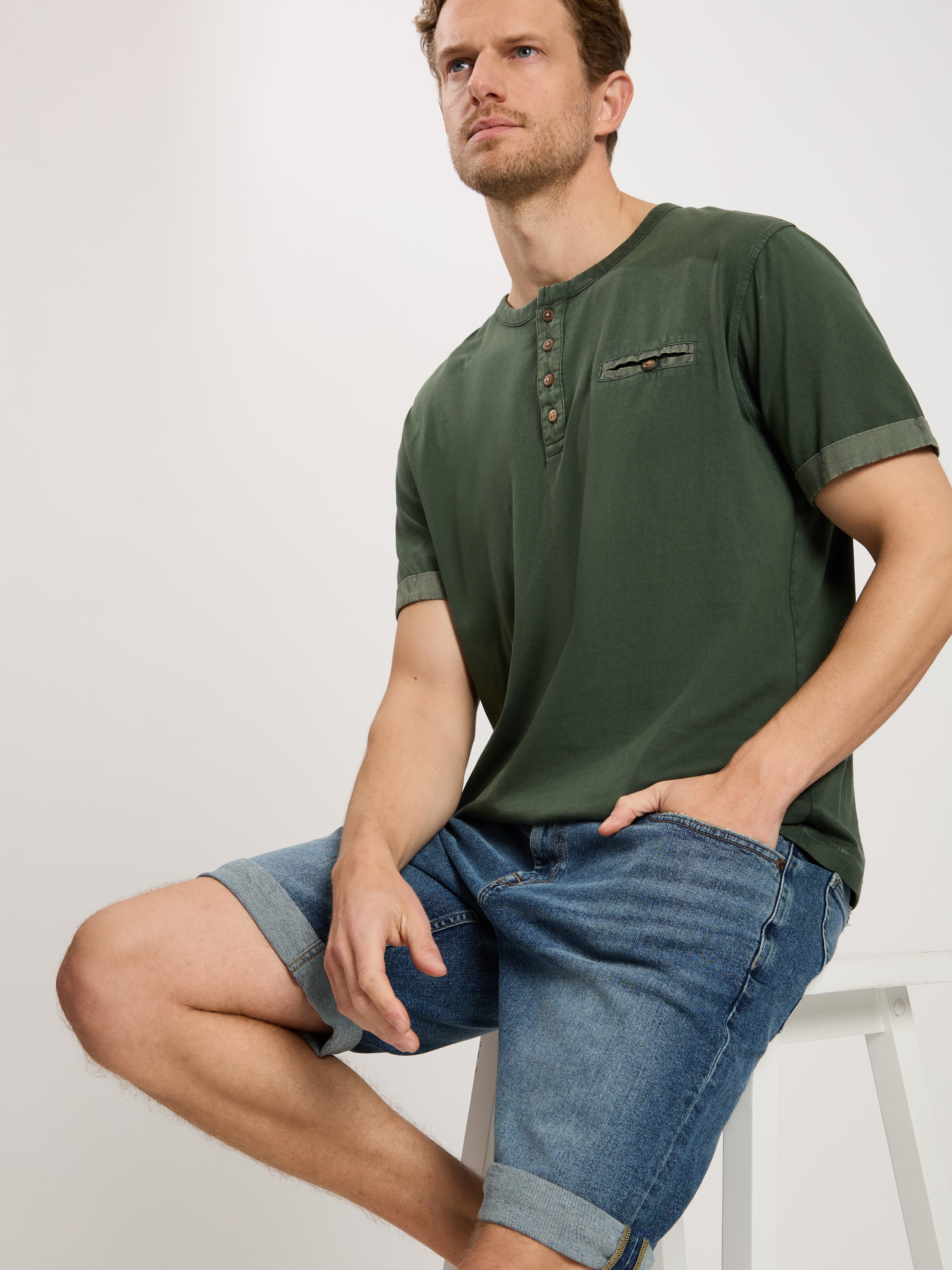 Design Besonderheiten: Used Look, farblich abgesetzte Nähte, gekrempeltes Beinende (nicht genäht)